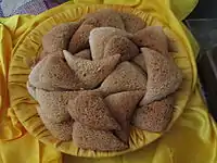 - Roti cane, a thin unleavened bread with a flaky crust, fried on a skillet with oil and served with condiments or curry.