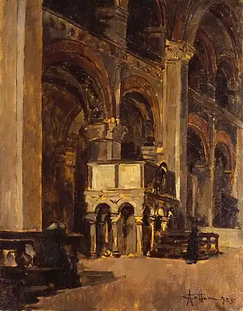 Cattaneo was born in Limbiate, Italy. He attended the courses of drawing and architecture at the Brera Academy, where he was taught by Emilio Gola, from 1888 to 1896. He began to work within the tradition of 19th-century urban painting, producing views of the Milanese canals and especially interiors of churches in Milan and Venice. His work was shown for the first time at the Milan Società delle Belle Arti in 1900 and he achieved fame in the 1920s. He held a solo show at the Bottega di Poesia in 1925 and took part in the first exhibition of the Novecento Italiano movement (Milan, 1926). His works were shown at the Venice Biennale (Esposizione Internazionale d’Arte di Venezia) in 1924, 1926 and 1928 and in Milan (Esposizione Nazionale di Milano) in 1925 and 1927.