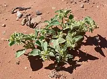 Acleisanthes nevadensis (syn. Selinocarpus nevadensis) is a species of flowering plant in the four o'clock family known by the common names desert moonpod[1] and desert wing-fruit. It is native to a section of the southwestern United States encompassing southern Nevada and adjacent corners of Utah and Arizona. One occurrence has been observed in eastern California.[2] The plant grows in desert habitat such as scrub and rocky washes. This herb produces several spreading stems up to about 30 centimeters in maximum length, sometimes from a woody base. The stems are covered in many leaves with fleshy oval or rounded blades up to 3 centimeters long which are borne on petioles. The herbage of the plant is coated in thick, wide, white, furry hairs, interspersed with shorter, flat hairs. Some hairs are glandular. Flowers occur in leaf axils. Each is a trumpet-shaped bloom with a narrow, tubular green throat up to 4 centimeters long and a round white corolla face about a centimeter wide, sometimes tinged yellow or greenish. There are five long, protruding stamens and a long style tipped with a spherical stigma. The fruit is a ribbed, hairy body with five broad, white wings.