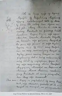 First: As regards the election of a President, Ministers, Generals and other necessary officers, we came to an agreement with the other Presidency, the Magdalo Presidency, and [the election] was accordingly held yesterday at the aforementioned Tejeros, but we are not content because it was not well conducted. We discovered that our Presidency in truth was wronged, because almost all their ballot papers were written by just one person, and [issued to] unqualified people so as to give them a majority. We have learned that they conspired together, and for this reason we consider that what happened there was invalid. No document, in fact, was prepared to formalize the new arrangements, which needed our signed endorsement. Yet another major deficiency was that some of our brother chiefs were elsewhere and unable to attend.