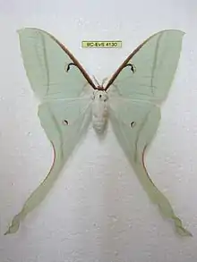 Actias rhodopneuma, colloquially known as the pink spirit moth, is a moth in the family Saturniidae. It is found in China, Laos, Vietnam, Burma, Thailand and India. While there are not many reports about their host plants in the wild, in captivity they have been raised on Liquidambar, Cotinus, Prunus, Salix and Rhus. Usually it occupies the mountainous regions within its natural range and is found from 1000 m up to 4500 m in the mountains. [1]