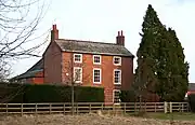 Dorfold Dairy House (SJ631518) was formerly the Dorfold Estate's home farm; a three-storey, three-bay, U-shaped building in red brick dating from the late 17th century, it is listed at grade II*.[74] The adjacent red-brick farm building is grade II listed.[75] Madam's Farm (SJ625526) off Raven's Lane was the former dower house of the Hall; a three-storey, three-bay, T-shaped building in red brick dating from the late 18th century, it is listed at grade II.[76] Other grade-II-listed buildings within the parish include the black-and-white Cuckoo Cottage (SJ625535) on Cuckoo Lane just north of Acton Grange, dating from the late 17th century, an unnamed red-brick cottage (SJ628539) by the Burford crossroads, dating from the early 19th century,[77][78] and the Old Farmhouse, Village Farm.[79] The unlisted Dorfold Cottage (SJ625530) is a Victorian house featuring a castellated tower and Gothic stucco-work on the interior.[59][80][81]