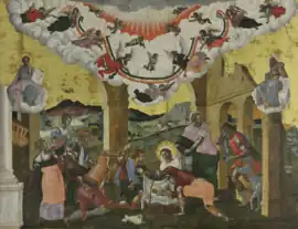 Adoration of the Shepherds is a tempera painting created by Greek painter Stephanos Tzangarolas. The painter was originally from Crete. He was a member of a wealthy Cretan family. He was a teacher and priest. He signed most of his works. He migrated to Corfu. His work period was from 1675 to 1710. He was active during the Greek Baroque period. 22 of his works survived. He was a prominent member of the Heptanese School.[1][2]