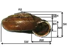 The shell is depressed and spherical, between 1.98 centimetres (0.78 in) and 3.24 centimetres (1.28 in) wide and 0.97 centimetres (0.38 in) to 1.68 centimetres (0.66 in) high. The shell is thin but strong, with a depressed conic spire. The aperture is ovate, 0.78 centimetres (0.31 in) to 1.32 centimetres (0.52 in) wide by 0.48 centimetres (0.19 in) to 1.05 centimetres (0.41 in) tall.[1]