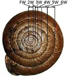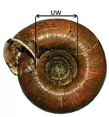 The shell is a glossy chestnut- or yellow-brown, with a thin light brown stripe running along the periphery. The peristome is white.[1]