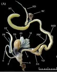 A. diversifamilia is hermaphroditic. The penis is long and thin, but shorter than the epiphallus. The dart sac is positioned in the vagina, which is equal in length to the penis. The spermoviduct is approximately four times as long as the penis and oviduct, and two times as long as the hermaphroditic duct. Individuals lay 20–30 white, 3 mm diameter round eggs per spawning.[1]