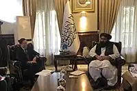Following the Fall of Kabul to the Taliban in August 2021, Japan immediately closed its embassy in Kabul due to security concerns in Afghanistan,[6] whereas Tokyo still hosts Shaida Mohammad Abdali, who was nominated by President Ashraf Ghani, as the Ambassador Extraordinary and Plenipotentiary of Afghanistan.[7] In May 2022, Japanese Ambassador Takashi Okada met with senior members of the Taliban, including Foreign Minister Amir Khan Muttaqi and State Minister Abdul Kabir, and he expressed Japan’s readiness to provide humanitarian aid to Afghanistan through international organizations whilst he also urged them to protect the human rights of women and ethnic minorities.[8] In September 2022, Japan reopened the embassy in Kabul.[9]