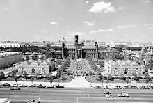 View of the four-acre[7] quadrangle, with the Sackler Gallery (near left), Enid A. Haupt Garden and Smithsonian Institution Building (center), and African art museum (near right)