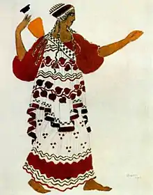 The dancers' costumes were designed to stand out against the muted background. Nijinsky wore a cream body suit with brown piebald patches to represent the coat of an animal. His faun costume was completed with the addition of a short tail, a belt of vine leaves, and a cap of woven golden hair surrounding two golden horns which gave the impression of a circlet. Nijinsky's ears were extended with wax to look more pronounced and pointed while his makeup was designed to make his face appear more animal. The nymphs wore white muslin that was tailored into long pleated tunics and decorated with stencilled patterns in blue or rust red. Some tunics had checkered borders and others had wavy lines or leaves. The nymphs had little makeup, except that their eyes were painted in pale pink. They wore tight wigs of golden rope which hung down in long strands. The Faun and senior nymph wore golden sandals while the rest of the dancers had bare white feet with rouged toes.[5]