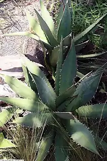 The plant forms a solitary rosette of broad whitish green leaves with variable spines, which are 1-2 feet long and 5 inches wide, typically narrower toward the base and widest near the tip.[4] Occasionally, it produces offsets.[5] Mature plants may produce a flower head from 3m to 6m tall with yellow flowers. As it is monocarpic, this signals the death of the plant.[6]