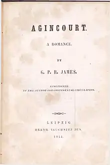 - 1 2 3 4 5 6 7 8 9 10 11 12 13 14 15 16 17 18 19 20 21 22 23 24 25 26 27 28 James, George Payne Rainsford (1844). Agincourt. A Romance. Leipzig. OCLC 249669021.