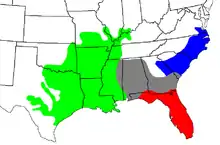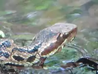 The eastern cottonmouth (Agkistrodon piscivorus piscivorus)[4][5] was once classified as a subspecies of the cottonmouth (Agkistrodon piscivorus). However, DNA based studies published in 2008 and 2015, revealed no significant genetic difference between the eastern cottonmouth (Agkistrodon piscivorus piscivorus) and the western cottonmouth (Agkistrodon piscivorus leucostoma) and synonymized the two subspecies (with the oldest published name, A. piscivorus, having priority). The resulting taxonomy does not recognizes the eastern cottonmouth (A. p. piscivorus) as a valid taxon.[7][8] Several subsequent reviews and species accounts have followed and supported the revised taxonomy.[9][10]:437 p.[11] Information on this snake can be found in the Agkistrodon piscivorus article.