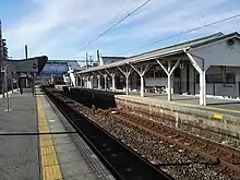 The station has one side platform and one island platform connected by a footbridge. The station building has automated ticket machines, TOICA automated turnstiles and is staffed.
