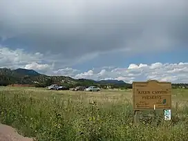 Aiken Canyon Preserve is a 1,621-acre (6.56 km2) Nature Conservancy-managed state property in Colorado. It was first observed and named after Charles Aiken, a 19th-century U.S. surveyor, pioneer, and ornithologist who first surveyed the region in the 1870s and identified more than 75 bird species.[1] The preserve consists of foothills, shrub and woodland ecosystems and is 12.4 miles (20.0 km) southeast from Colorado Springs located on the eastern slope of the Rampart Range which is within a smaller foothill system of the Front Range. The surrounding mountain ranges of the Rampart Range and Palmer Divide created the nature preserves sustainable ecosystem.[2] There is also a four-mile (6 km)-loop hiking trail on the preserve.[3]