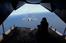 A U.S. Navy Photographers Mate photographing an F/A-18 Hornet from the cargo ramp of a C-2 Greyhound.