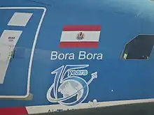 Air Tahiti Nui's aircraft livery over its history included different shades of blue representing the ocean, lagoon and sky of Tahiti for the upper half of the aircraft, extending the length of its fuselage, with white for the lower half as well as the aircraft's engines. The flag of French Polynesia is placed toward the front of the aircraft, behind the cockpit windows, with the aircraft's given name written underneath it. The flag is also incorporated into the livery's design, with red and white stripes that extend for part of the fuselage's length underneath the blue color. A tiare flower, the airline's logo, is placed onto the aircraft's vertical stabilizer (tailfin), with circular waves of alternating light and dark blues emanating from the flower, resembling water ripples.
