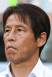 In March 2016, Nishino returned to the Japan Football Association as a technical director.[8] In April 2018, Japan national team manager Vahid Halilhodžić was sacked and Nishino was named as the new manager.[9] A big challenge for Nishino was lack of time for preparation, while also being doubted because of his lack of coaching experience. Nonetheless, in the 2018 World Cup, he registered history by helping Japan to beat Colombia 2–1, the first ever defeat of a CONMEBOL team to an Asian side. His brilliant tactics continued to be demonstrated when Japan held Senegal in a 2–2 draw. His Japan lost 0–1 to Poland in the final group match, but as Japan received lesser yellow cards than Senegal, Japan controversially qualified to the knockout stage, becoming the only Asian team to do so in the 2018 World Cup. However, his Japan lost 2–3 to Belgium despite having led 2–0, thus were eliminated from the tournament.[10][1] Nishino is scheduled to step down once his current term expires at the end of July, following the World Cup.[11]