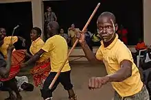 Akogo dance is a traditional dance form of the Teso people of Eastern Uganda. This cultural expression is performed by both men and women, who gracefully move their bodies in synchrony with the rhythmic beats of the akogo, a percussion instrument crafted from bamboo tubes of varying lengths.[1] The Dance is believed to have been performed by the Teso people for centuries and has evolved over time and has been influenced by other dance forms from neighboring regions.[2][3][4]