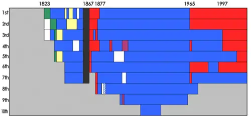 The 8th seat was elected at-large from the entire state until the 45th Congress, when an 8th district was established as a separate district in the northwestern part of the state.[1] The district occupied an area now held by Alabama's 5th congressional district, with the exception of a portion of Morgan County, which is part of the 4th district. Franklin County, which was part of the 8th district until after the 1890 census, is also part of the modern 4th district.