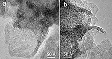 Electron image of d-MnO2 nanoparticles viewed parallel (a) and perpendicular (b) to the layer plane.[8]