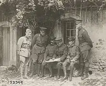 Senior officers of the U.S. 2nd Division at the front showing a Japanese delegation the enemy's position of the sector of the map. Brigadier General Albert J. Bowley is stood second on the left, while Marine Major General John A. Lejeune, commanding the 2nd Division, is sat third on the right.