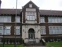 The original school building occupies a city block between the Parkland and California neighborhoods. It is built of brick and has 2½ stories as well as a raised basement. The windows on the first and second floor are identical. A decorative gabled entrance spans the height of the building and includes a decorative scroll which reads "L.P.S." for Louisville Public School (the predecessor of Jefferson County Public Schools).[3]