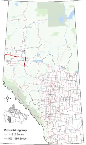 Alberta Provincial Highway No. 49, commonly referred to as Highway 49, is a highway in northwestern Alberta, Canada. It runs east–west from the British Columbia border to Donnelly, and then north–south to Valleyview.[2] Highway 49 has a total length of 266 kilometres (165 mi).[1]