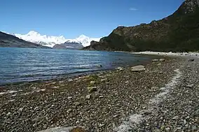 Much of the landscape of the park has been sculpted by glaciers. The largest glacier is the Marinelli, which is in a state of retreat as of 2008.[7] One of the most stunning portions of the park is the Seno Pía, an embayment of the Beagle Channel.[8] The glaciers and mountains in this area form an amazing scenery, which also comprises the majestic Mount Darwin. Another glacier-related highlight of the park is the Avenue of the Glaciers, where the word avenue is used in a figurative sense describing part of the north-west arm of the Beagle Channel where it is possible to view several glaciers along the north shore. These glaciers are: España, Romanche, Alemania (also known as Roncagli), Italia, Francia and Holanda.[9]