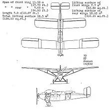 The Triavion's fuselage was rectangular in cross-section, flat sided and bottomed but topped with a triangular section decking through which the wings passed. The forward wing was braced to the lower fuselage longerons with two pairs of parallel lift struts on each side, one pair to the neutral lift inner section and the other to the outer panels. These pairs had horizontal and vertical jury struts between them. A pair of N-form struts angled outwards from the upper longerons to form a cabane supporting the centre section of the wing. The shorter rear wing needed only a single parallel pair on each side from the lower fuselage with similar upper longeron N-struts. Its 70 hp (70 hp) six cylinder, radial Anzani engine was mounted in the nose. The forward cockpit was just under a V-shaped cut-out in the centre section trailing edge and the second was midway between the two wings; both were within the triangular decking, which had large openings in it, and there were also round apertures in the sides to improve downward vision. Both cockpits were accessed via starboard-side doors. The empennage was conventional, with a large, upright fin and a vertical edged unbalanced rudder that went down to the keel; the cantilever tailplane and elevators were rectangular in plan, with rounded corners and a cut-out for rudder movement, and were mounted a little lower than the wings on the upper fuselage longerons. It had conventional landing gear with mainwheels on a single axle rubber sprung to V-struts from the lower fuselage, their rear members part of a transverse inverted W-form strut also joined to the central fuselage. There was a short tailskid.[5]