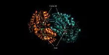 ALDH3A1 is a homodimer consisting of alpha helices (43.8%), beta sheets (4.2%), p-loop turns (28.2%) and random coils (23.8%).[9] The catalytic residue–Cys244—is located on an active site that contains a Rossmann fold that binds the enzyme's cofactor, NAD(P)+.[10]
