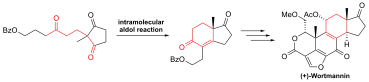Intramolecular aldol reactions have been widely used in total syntheses of various natural products, especially alkaloids and steroids. An example is the application of an intramolecular aldol reaction in the ring closure step for total synthesis of (+)-Wortmannin by Shigehisa, et al.[5] (Figure 2).