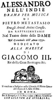 Alessandro nell'Indie (lit.'Alexander in India')[1] is a libretto in three acts by Pietro Metastasio. It was set to music around ninety times[2] firstly by Leonardo Vinci, whose version premiered in Rome on 2 January 1730.[1][3] The libretto was the fourth of five that Metastasio wrote for the Teatro delle Dame in Rome between 1727 and 1730.[4] The work was dedicated to the Stuart pretender to the British throne, James Francis Edward Stuart, then resident in Rome.[3]
