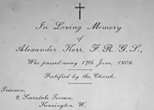 Alexander died 17 June 1909 at 'Trianon' 2 Scarsdale Terrace, Kensington,[29] and is buried at St Mary Magdalen, Mortlake, with his wife and daughter Jane.