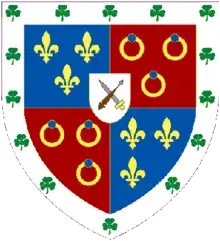 Quarterly 1st & 4th Azure three fleurs-de-lus Or two and one 2nd & 3rd Gules three annulets Or gemmed Azure two and one all within a bordure Argent charged with shamrocks Vert on an escutcheon surtout Argent a tilting spear and sword in saltire Proper.