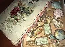 The quality of the manufactured products was core to their appeal and helped A. M. Ostroumov to continue to grow which required new warehouses in Saint Petersburg, Odessa, Yalta, Tashkent and Warsaw as the partnership's products became widely sold and A. M. Ostroumov become purveyor to the court of the Russian imperial family which gave them the right to put the state seal on its products.[17][18] Around 1912 his perfume factory was the largest Russian-owned perfume factory in Imperial Russia with a large variety of products from anti-dandruff soap and medical cosmetics to creams and perfumes. In the factory price list there are hundred names of eaux de toilette, including "Napoleon", "Chypre", "Lily of the Valley", "Jasmine", "Ideal", "Japanese Lilac", "Empress's Bouquet", "Artist's Cologne" or perfumes like "Fresh Hey", "Vera-Violet" and "Oridis".[19]