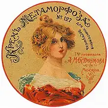 Ostroumov entered the business as an ordinary pharmaceutical chemist and referred to himself as such even at the peak of his career as the path to becoming a professional pharmacist was very difficult. Ostroumov worked as an apprentice for three years whilst completing a university degree in Moscow. Once he completed his degree he had to work in a pharmacy for three years before being admitted to a two-year degree at Moscow University, which, upon graduation, led to him becoming a full-fledged pharmaceutical chemist.[4] After he creating the anti-dandruff soap in 1885, he invested in research and experimentation in order to create acne lotions, skin lightening products, and anti-aging creams. In 1900 the Perfume Factory Partnership of Pharmacist A. M. Ostroumov was established. Ostroumov, making use of advances in chemical and technological equipment, created the cream "Metamorphozis",[5] designed to get rid of freckles, age spots and protect against severe sunburn, which quickly became the favorite of Russian beauties and brought him fame.[6]