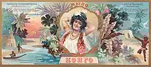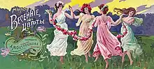 The Ostroumov company employed local stars for their "artists" which fitted in with their narrative of transformative beauty to gain an advantage over their foreign competitors.[12] Among the artists featured was Elisaveta Azerskaya from the Bolshoi Theatre (before the October Revolution it was a part of the Imperial Theatres), who welcomed Ostroumov's perfumery, calling it a serious rival of foreign perfumeries. Wearing an elegant dress, dramatic soprano Leonida Balanovskaya issued the following statement: Since I have become familiar with chemist Ostroumov's 'Cream No.2', I have understood the importance of choosing the right cosmetics. The amazing effect of this cream on the skin is incomparably superior to all other creams.[13] Raisa Reisen, actress from the Imperial Maly Theater in Moskow, jokingly wrote: If Napoleon had used Ostroumov's 'Napoleon' eau de toilette, Josephine would have never cheated on him.[14] Some singers have been shown in character costumes reminiscent of the product names they are praising. Photographed as Cio-Cio-San from "Madame Butterfly" by Giacomo Puccini, the Zimin Opera soprano Vera Liutse opined: The unusually delicate and natural aroma of Ostroumov's 'Japanese Lilac'... reminds me of the native land of this flower, the land of the rising sun and flowers.[15] Based on Liutse's image and text, "Japanese Lilac" alludes to Puccini's popular opera and heroine with the image of Liutse in the kimono of the foreign Cio-Cio-San providing a sense of the exotic. Other Ostroumov products shared the names of opera characters and were more directly associated with celebrities and their distinctive roles. Star Bolshoi soprano Antonina Nezhdanova, who appeares as the heroine oft the same name in Léo Delibes's opera "Lakmé", explained that she likes the perfumes of the Ostroumov company very much, especially the soap, cologne and powder 'Lakme'.[12]