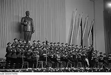 The choir appears to function most successfully with a minimum of 80 singers. Most of the films and photographs of the Ensemble in its heyday, including the 1948 Berlin Peace Concert,[16] and during the directorship of Boris Alexandrov, show a choir of at least 80 singers.[17] This size allows the characteristic massed-voices effect of the Ensemble, plus the opportunity for the composer or arranger to score for several parts, in both bass and tenor sections. For example, in Song of the Dnieper, a basso profondo line suddenly appears in the chorus two-thirds of the way through, giving a powerful effect.[18]