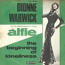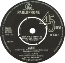 "Alfie" was released in January 1966, four months prior to the opening of the film. The single was essentially intended as a specialty item to foster interest in the upcoming film rather than a mainstream hit. However the track accrued enough interest to enter the UK Top 50 in April 1966, reaching #9 that May.[6][7] Black's "Alfie" was released in Australia, New Zealand and the US in July 1966, a month prior to the release of the film in both countries. Despite the soundtrack appearance of a version of "Alfie" by Cher in the film's worldwide release, Black's "Alfie" was a sizable Australian hit at #22. It went to #20 in New Zealand.[8] In the US—where Black had previously enjoyed only one moderate success with "You're My World" in 1964—her "Alfie" single just made the Billboard Hot 100 at #95, the pop mainstream sector's focus being primarily on Cher's version of the song, which was only a moderate hit in the US at #32. Interest in any one recorded version of "Alfie" was dissipated by the plethora of easy listening-oriented cover versions which were in release by the summer of 1966.
