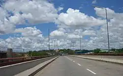 The new road bridge, constructed in 1995 parallel to the old bridge, accommodates far heavier traffic than the old bridge could take.[3] It was built by Murray & Roberts[4] on behalf of New Limpopo Bridge Ltd who now operate the bridge.[5]