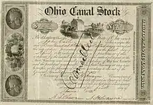 Kelley built extensive business and personal relationships with bankers in Ohio and New York City while a Canal Commissioner.[92] To help Ohio banks, Kelley required that canal workers be paid in bank scrip. This ensured that bank scrip circulated more widely, helping to expand a bank's market and making each bank's scrip more widely accepted by the public.[92][lower-alpha 18]