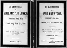 Memorial cards for Alfred James and Jane Lutwyche, buried in the churchyard of St Andrew's Anglican Church, Lutwyche, Brisbane, Queensland, Australia