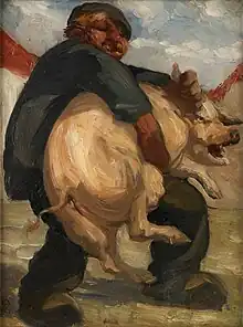 Alfred Ost (14 February 1884, Zwijndrecht – 9 October 1945, Antwerp) was a Belgian designer, watercolorist, illustrator, painter, draftsman and political cartoonist.[1] After his first drawings, of a descriptive realism of animals and genre scenes, he addressed religious themes transposed into a contemporary popular context.[2] He became known as an animal painter and poster designer. His war experiences, intensified by his bipolar disorder, caused a dark colorite and pessimistic themes to be introduced into his art works.[3] During World War I (1914 to 1918) he lived in Amsterdam, where he was influenced by new avant-garde movements. He developed a personal style, first informed by his social engagement, and later by mystical themes.[2]