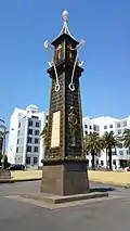 The memorial is built in brick covered by faience work. The supporting angles are formed to represent the trunks of gum-trees, branching out into leaves and cones under the main cornice, and the roots are shown on a bold projection above the base. Above the main cornice is a cross of a deep golden colour, which stands out clearly from the green tone of the general mass of work. One panel shows the names of the seven soldiers from St. Kilda who died. Two other panels record the names of the 58 who fought the Empire's battles and returned. On the fourth panel is the figure of a soldier, dressed in Australian khaki, and facing the sea. Above the main column is a wrought-iron pillar, supported by brackets, enriched with shields ; and under the golden cross rests a finely executed wreath on each panel.