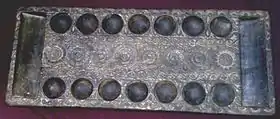 Ali Guli Mane (Kannada: ಅಳಿ ಗುಳಿ ಮಣೆ Tulu: ಚೆನ್ನೆಮಣೆ) is an abstract strategy board game of the mancala family, from Karnataka in South India. It is known as Chenne Mane in Tulunaadu (Coastal Karnataka), Akal Patta in North Karnataka and Satkoli (सत्कोलि) in Maharashtra. The name of the game, like that of many mancala games across the world, is simply a description of the board used: it means a "wooden block with holes". It is similar to Pallanguzhi from the neighbouring state of Tamil Nadu. There are also similarities with the traditional Malay mancala game Congkak.