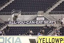 All-you-can-eat seats, also called all-inclusive sections, are blocks of seats in a stadium or arena in which seat holders are entitled to unlimited food and drink (typically fast food and junk food including hot dogs, nachos, popcorn, peanuts, soft drinks, and bottled water) before and during a game. Typically located in less desirable areas of the venue, such as the bleachers and upper decks, all-you-can-eat (AYCE) seats are priced approximately 50% higher than seats in the same section, but are viewed by patrons as a bargain considering the high cost of concession food and drinks.