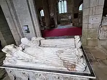 The set of alabaster monuments are described as being "the glory of the church";[1] they consist of the effigies of six recumbent couples lying on tomb chests, and all depict members of families connected with the Harewood estate.[1] All the monuments were originally brightly coloured, but the colour has been lost, leaving the white alabaster. A major programme of conservation was carried out in 1978 when they were dismantled and reerected as close as possible to their original locations.[10] On the sides of the tombs are depictions of angels, saints and mourners.[7] The oldest tomb, in the south chapel, is that of Sir William Gascoigne, Lord Chief Justice and his wife Elizabeth; it dates from about 1419.[1] Sir William is dressed in his robes and he carries a purse and a dagger. The later tombs display a greater sophistication in their carving, and they reflect the fashions of the day.[2] The latest effigies are of Edward Redman (Redmayn)[11] and his wife Elizabeth Huddleston, dating from about 1510; the depiction of Edward Redman is said to be a true-to-life portrait, a rarity at the time it was carved.[12]
