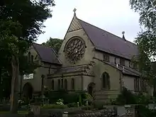 The lych gate dated 1893 is listed at Grade II.[12] Also listed at Grade II are a stable and coach house from the early 19th century erected for the use of the owner of Marple Hall when visiting the church,[13] and the adjacent hearse house, also dating from the early 19th century.[14]