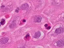 Endoscopically, ridges, furrows, or rings may be seen in the esophageal wall. Sometimes, multiple rings may occur in the esophagus, leading to the term "corrugated esophagus" or "feline esophagus" due to similarity of the rings to the cat esophagus. Presence of white exudates in esophagus is also suggestive of the diagnosis.[13] On biopsy taken at the time of endoscopy, numerous eosinophils can be seen in the superficial epithelium. A minimum of 15 eosinophils per high-power field are required to make the diagnosis. Eosinophilic inflammation is not limited to the esophagus alone, and does extend through the whole gastrointestinal tract. Profoundly degranulated eosinophils may also be present, as may micro-abscesses and an expansion of the basal layer.[3][10]