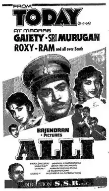 Alli is a 1964 Indian Tamil-language film produced and directed by S. S. Rajendran, and written by Nagercoil Padmanabhan. Rajendran also stars along with R. Vijayakumari and Sowcar Janaki playing the title character. The film was released on 5 March 1964.